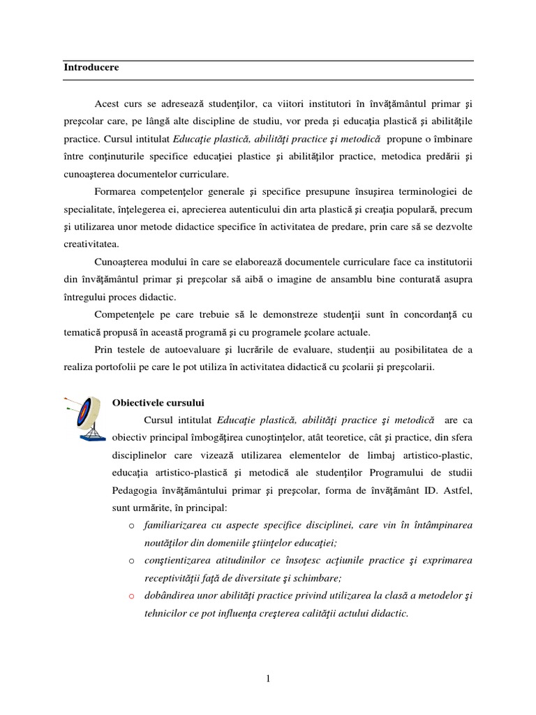 Cursul intitulat Educaţie plastică, abilităţi practice şi metodică are ca