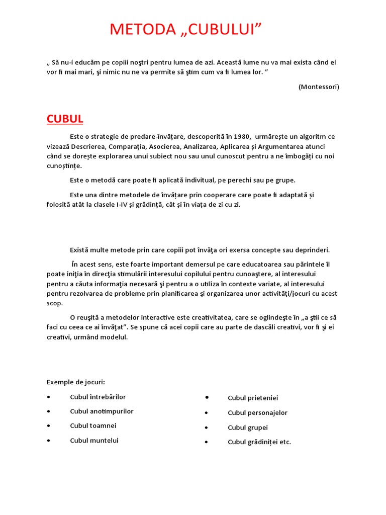 Metoda cubului este folosita mai ales la scoala, dar poate fi adaptata si pentru