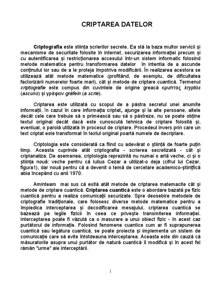 Criptografia este stiina scrierilor secrete. Ea st la baza multor servicii i mecanisme de securitate folosite n internet, securizarea informaiei precum i cu autentificarea i restricionarea accesului ntr-un sistem informatic folosind metode matematice pentru transformarea datelor n intentia de a ascunde coninutul lor sau de a le proteja mpotriva modificrii. n realizarea acestora se utilizeaz att metode matematice (profitnd, de exemplu, de dificultatea factorizrii numerelor foarte mari), ct i metode de criptare cuantic. Termenul criptografie este compus din cuvintele de origine greac krypts (ascuns) i grfein (a scrie). Criptarea este utilizat cu scopul de a pstra secretul unei anumite informaii. n cazul n care informaia criptat ajunge i la alte persoane, altele dect cele care trebuie s o primeasc sau s o pstreze, nu se poate obine textul original dect dac este cunoscut tehnica de criptare folosit i, eventual, o parol utilizat n procesul de criptare. Procedeul invers prin care un text criptat este transformat n textul original poart numele de decriptare. Criptologia este considerat ca fiind cu adevrat o tiin de foarte puin timp. Aceasta cuprinde att criptografia - scrierea secretizat - ct i criptanaliza. De asemenea, criptologia reprezint nu numai o art veche, ci i o tiina nou: veche pentru c Iulius Cezar a utilizat-o deja (cifrul lui Cezar, figura1), dar nou pentru c a devenit o tem de cercetare academico-tiinfic abia ncepnd cu anii 1970. Aminteam mai sus c exit att metode de criptarea matemacite ct i metode de criptare cuantic. Criptarea cuantic este o abordare bazat pe fizic cuantic pentru a realiza comunicaii securizate. Spre deosebire metodele de criptografie tradiionale, care folosesc diverse metode matematice pentru a mpiedica interceptarea i decodificarea mesajului, criptarea cuantic se bazeaz pe legile fizicii n ceea ce privete transmiterea informaiei. Interceptarea poate fi vzut ca o masurare a unui obiect fizic - n acest caz purttorul de informaie. Folosind fenomene cuantice cum ar fi suprapunerea cuantic sau legtura cuantic, se poate proiecta i implementa un sistem de comunicaie care s evite ntotdeauna interceptarea. Aceasta este din cauz c msuratorile asupra unui purttor de natur cuantic l modific i n acest fel rmn "urme" ale interceptrii.