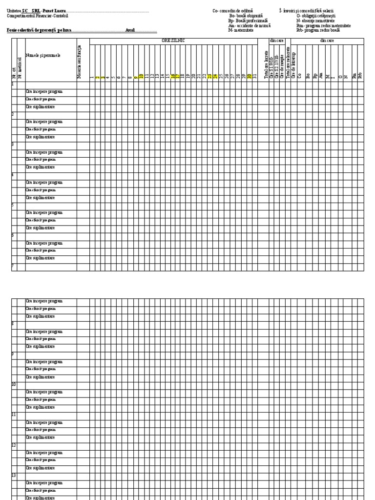 Foaie colectivă de prezenţă pe luna...................................................Anul..................... M- maternitate Prb- program redus boală