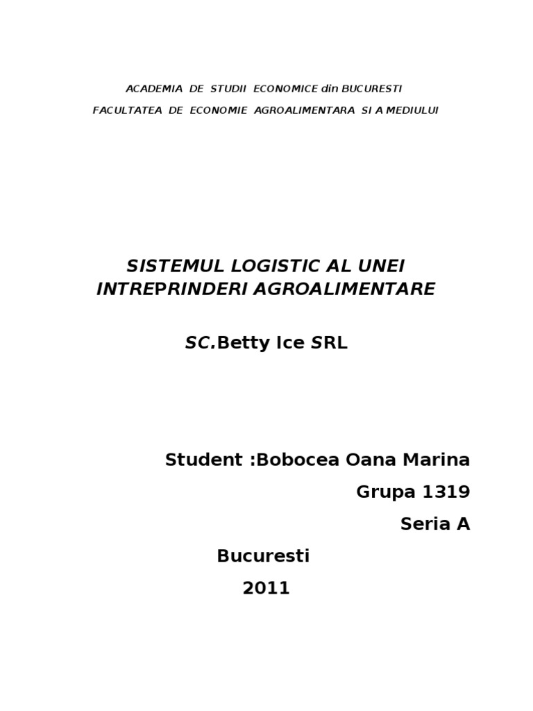 [Link] i propuneri pentru mbuntirea activitii logistice din societate Concluzii Distributia indeplineste un rol hotatrator in activitatea intreprinderii Betty Ice. Aceasta si-a stabilit filiale pe tot teritorul rii pentru a eficientiza acest proces. Are o flot de autovehicule proprie iar pe timp de vara, cand cererea depete posibilitile de satisfacere, apeleaz la firme de distributie cu care are incheiate contracte de colaborare. Flota de autovehicule are un sistem propriu de supraveghere prin GPS(Global Positioning System) ceea ce implic monitorizarea permanent a intregului proces de distributie pe intreg teritoriul tarii. Este o societate care s-a dezvoltat ca urmare a unui management bun, deoarece tot profitul obtinut l-a reinvestit, crescnd calitatea, diversitatea si imaginea produselor. Societatea este n plina expansiune, sistemul de distributie mbunatatindu-se fata de anii anteriori, dar pentru a ajunge lider n perspectiva si peste hotare va trebui ca personalul si conducerea sa analizeze permanent fluctuatiile ce apar pe piata (n perspectiva pe noi piete internationale) si sa dea dovada de mult profesionalism si flexibilitate. Sistemul de distributie este bun si este n continua perfectionare, concurnd, cu bune rezultate, pe cele de la Napolact, Nestle, Kubo. Un merit deosebit l au si angajatii care sunt devotati societatii, deoarece sunt motivati. Cota de piata detinuta 20-25% este o cota destul de buna avnd n vedere multitudinea de concurenti. Firma trebuie sa fie n continua alerta pentru cstigarea unor noi clienti datorita concurentei acerbe. Cu toate ca dispune de o retea de distributie bine pusa la punct si produse de cea mai buna calitate firma nu reuseste sa obtina un profit maxim din cauza unor greseli de management care au loc la nivelul centrelor de distributie locale si din cauza lipsei de promovare a produselor. O alta concluzie consta n faptul ca politicile de promovare ale societatilor producatoare de nghetata s-au mbunatatit si s-au diversificat prezentare TV, la locul de vnzare, presa si organizarea de concursuri etc. impunnd o abordare profesionista a factorilor care influenteaza piata. Betty Ice este deci capabil sa satisfaca cererea consumatorilor multumita noi fabrici performante de care dispune urmand sa se extinda in anii ce urmeaza pe pietele Uniunii Europene.