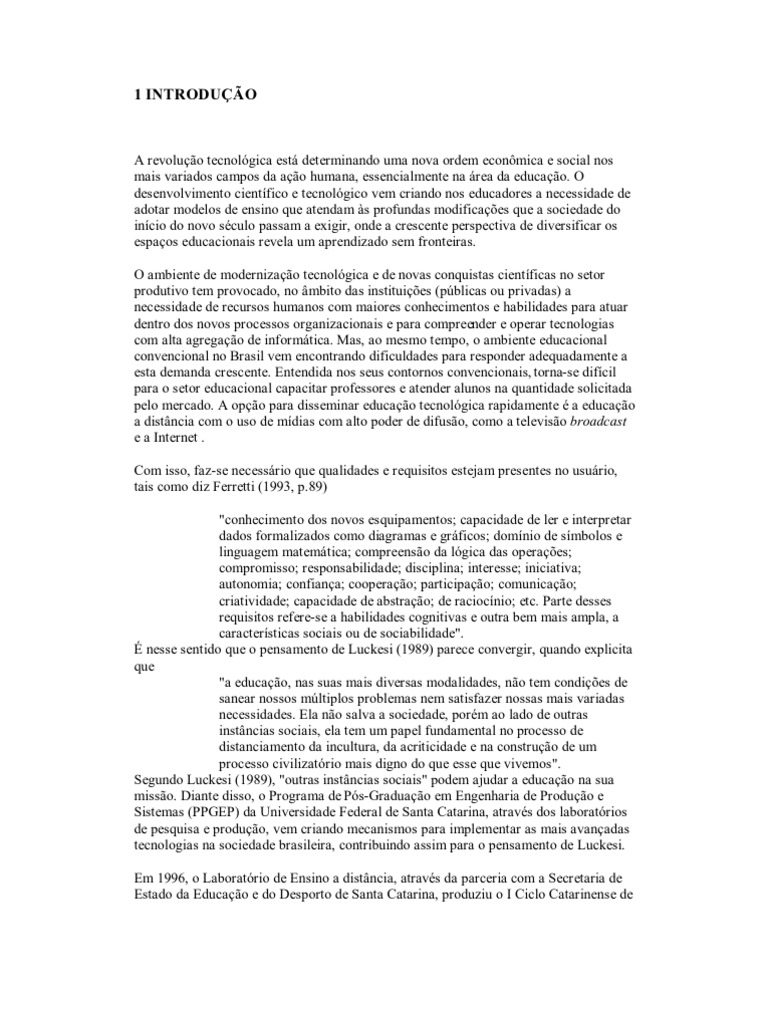A revoluo tecnolgica est determinando uma nova ordem econmica e social nos mais variados campos da ao humana, essencialmente na rea da educao. O desenvolvimento cientfico e tecnolgico vem criando nos educadores a necessidade de adotar modelos de ensino que atendam s profundas modificaes que a sociedade do incio do novo sculo passam a exigir, onde a crescente perspectiva de diversificar os espaos educacionais revela um aprendizado sem fronteiras. O ambiente de modernizao tecnolgica e de novas conquistas cientficas no setor produtivo tem provocado, no mbito das instituies (pblicas ou privadas) a necessidade de recursos humanos com maiores conhecimentos e habilidades para atuar dentro dos novos processos organizacionais e para compreender e operar tecnologias com alta agregao de informtica. Mas, ao mesmo tempo, o ambiente educacional convencional no Brasil vem encontrando dificuldades para responder adequadamente a esta demanda crescente. Entendida nos seus contornos convencionais, torna-se difcil para o setor educacional capacitar professores e atender alunos na quantidade solicitada pelo mercado. A opo para disseminar educao tecnolgica rapidamente a educao a distncia com o uso de mdias com alto poder de difuso, como a televiso broadcast e a Internet . Com isso, faz-se necessrio que qualidades e requisitos estejam presentes no usurio, tais como diz Ferretti (1993, p.89) "conhecimento dos novos esquipamentos; capacidade de ler e interpretar dados formalizados como diagramas e grficos; domnio de smbolos e linguagem matemtica; compreenso da lgica das operaes; compromisso; responsabilidade; disciplina; interesse; iniciativa; autonomia; confiana; cooperao; participao; comunicao; criatividade; capacidade de abstrao; de raciocnio; etc. Parte desses requisitos refere-se a habilidades cognitivas e outra bem mais ampla, a caractersticas sociais ou de sociabilidade". nesse sentido que o pensamento de Luckesi (1989) parece convergir, quando explicita que "a educao, nas suas mais diversas modalidades, no tem condies de sanear nossos mltiplos problemas nem satisfazer nossas mais variadas necessidades. Ela no salva a sociedade, porm ao lado de outras instncias sociais, ela tem um papel fundamental no processo de distanciamento da incultura, da acriticidade e na construo de um processo civilizatrio mais digno do que esse que vivemos". Segundo Luckesi (1989), "outras instncias sociais" podem ajudar a educao na sua misso. Diante disso, o Programa de Ps-Graduao em Engenharia de Produo e Sistemas (PPGEP) da Universidade Federal de Santa Catarina, atravs dos laboratrios de pesquisa e produo, vem criando mecanismos para implementar as mais avanadas tecnologias na sociedade brasileira, contribuindo assim para o pensamento de Luckesi. Em 1996, o Laboratrio de Ensino a distncia, atravs da parceria com a Secretaria de Estado da Educao e do Desporto de Santa Catarina, produziu o I Ciclo Catarinense de