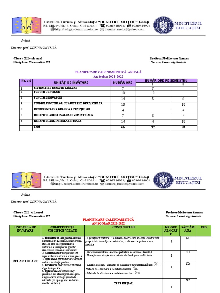 Disciplina: Matematică M2 Nr. ore: 2 ore / săptămână