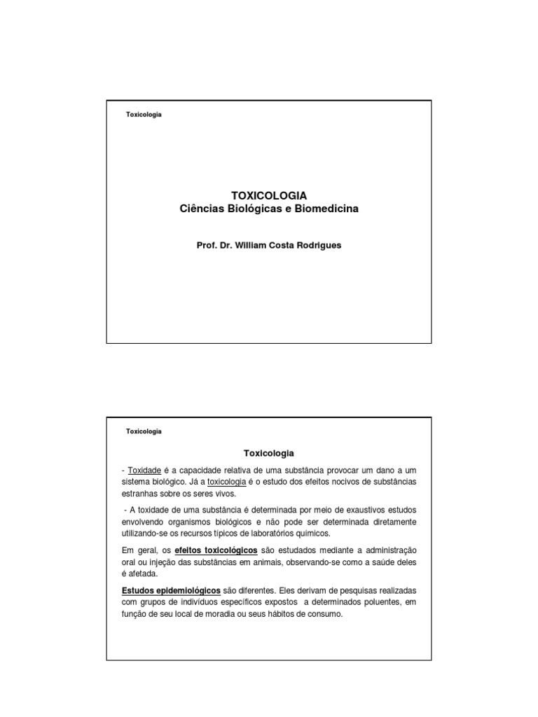 - Toxidade a capacidade relativa de uma substncia provocar um dano a um sistema biolgico. J a toxicologia o estudo dos efeitos nocivos de substncias estranhas sobre os seres vivos. - A toxidade de uma substncia determinada por meio de exaustivos estudos envolvendo organismos biolgicos e no pode ser determinada diretamente utilizando-se os recursos tpicos de laboratrios qumicos. Em geral, os efeitos toxicolgicos so estudados mediante a administrao oral ou injeo das substncias em animais, observando-se como a sade deles afetada. Estudos epidemiolgicos so diferentes. Eles derivam de pesquisas realizadas com grupos de indivduos especficos expostos a determinados poluentes, em funo de seu local de moradia ou seus hbitos de consumo.