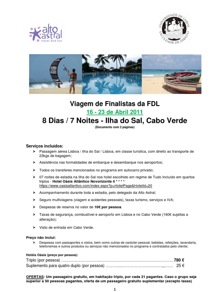 Passagem aérea Lisboa / Ilha do Sal / Lisboa, em classe turística, com direito ao transporte de 23kgs de bagagem; |
