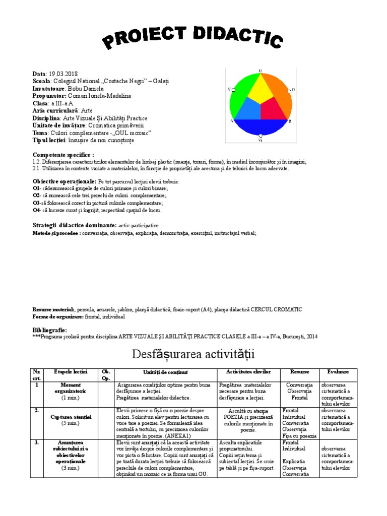 Resurse material:, pensula, acuarele, șablon, planșă didactică, foaie-suport (A4), planșa didactică CERCUL CROMATIC
