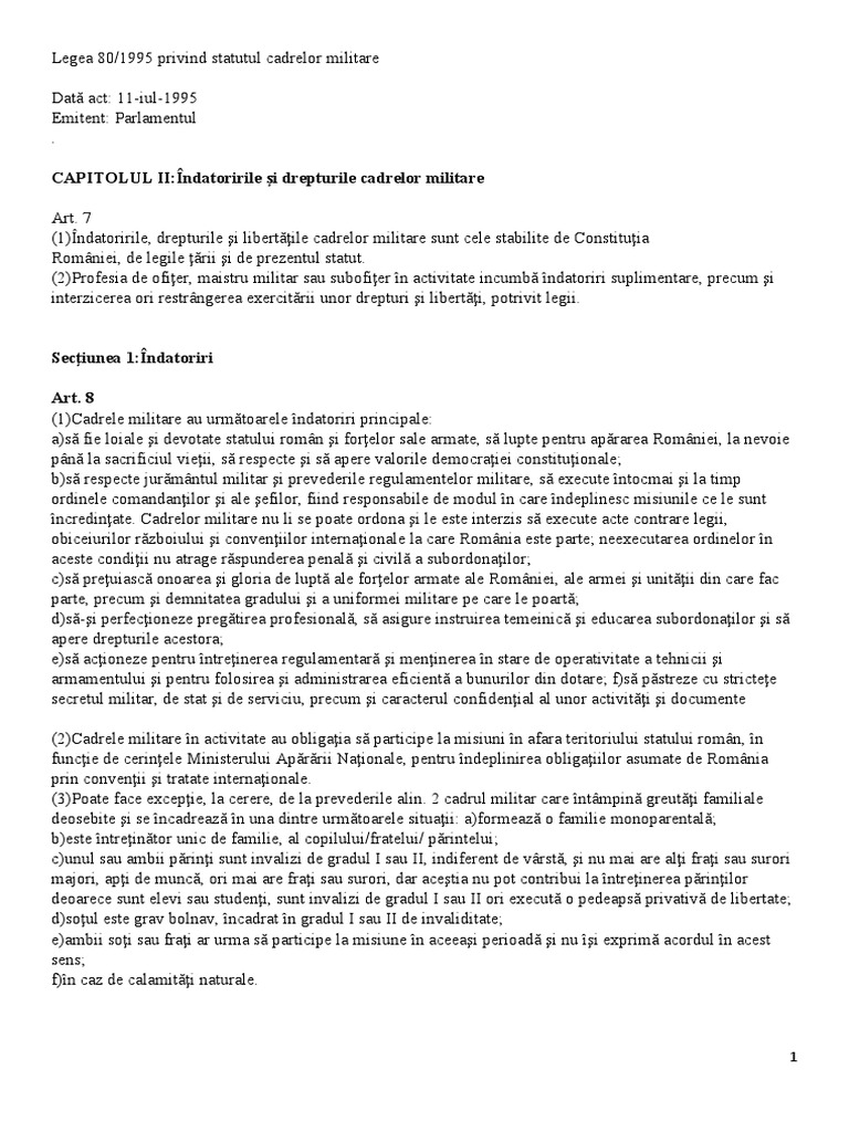 (1)Îndatoririle, drepturile şi libertăţile cadrelor militare sunt cele stabilite de Constituţia