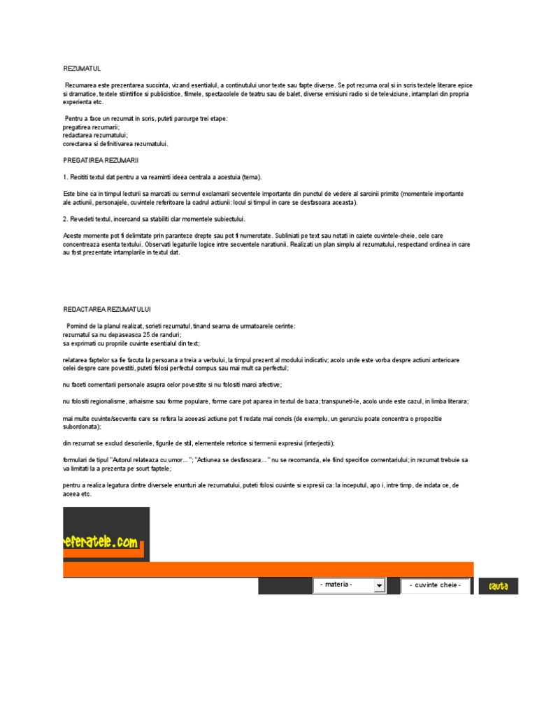 din rezumat se exclud descrierile, figurile de stil, elementele retorice si termenii expresivi (interjectii);