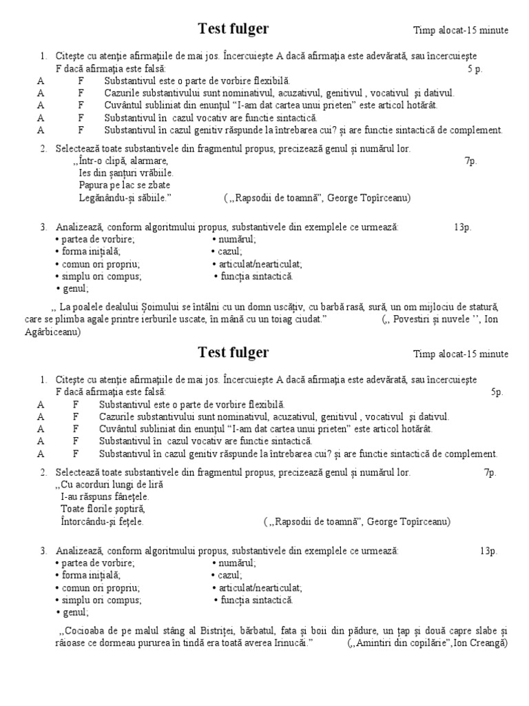 2. Selectează toate substantivele din fragmentul propus, precizează genul și numărul lor. 7p.