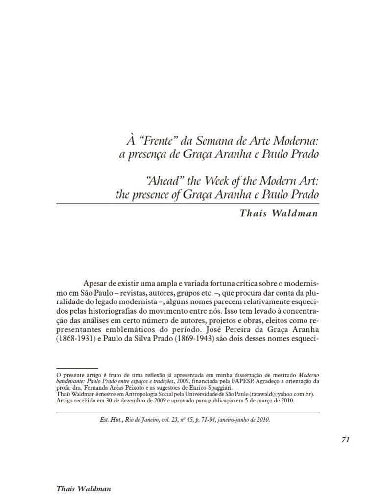 Apesar de existir uma ampla e variada fortuna crítica sobre o modernis- mo em São Paulo – revistas, autores, grupos etc. –, que procura dar conta da plu- ralidade do legado modernista –, alguns nomes parecem relativamente esqueci- dos pelas historiografias do movimento entre nós. Isso tem levado à concentra- ção das análises em certo número de autores, projetos e obras, eleitos como re- presentantes emblemáticos do período. José Pereira da Graça Aranha (1868-1931) e Paulo da Silva Prado (1869-1943) são dois desses nomes esqueci-