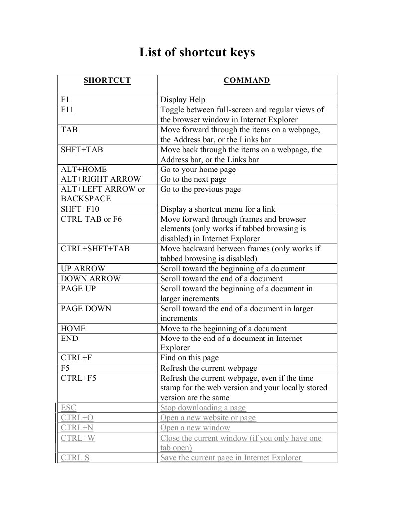 Display Help Toggle between full-screen and regular views of the browser window in Internet Explorer Move forward through the items on a webpage, the Address bar, or the Links bar Move back through the items on a webpage, the Address bar, or the Links bar Go to your home page Go to the next page Go to the previous page Display a shortcut menu for a link Move forward through frames and browser elements (only works if tabbed browsing is disabled) in Internet Explorer Move backward between frames (only works if tabbed browsing is disabled) Scroll toward the beginning of a do cument Scroll toward the end of a document Scroll toward the beginning of a document in larger increments Scroll toward the end of a document in larger increments Move to the beginning of a document Move to the end of a document in Internet Explorer Find on this page Refresh the current webpage Refresh the current webpage, even if the time stamp for the web version and your locally stored version are the same Stop downloading a page Open a new website or page Open a new window Close the current window (if you only have one tab open) Save the current page in Internet Explorer