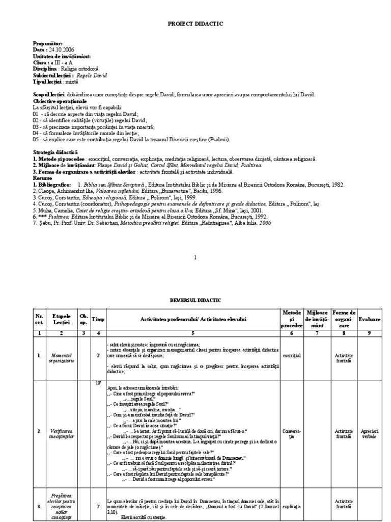 Scopul lecţiei: dobândirea unor cunoştinţe despre regele David; formularea unor aprecieri asupra comportamentului lui David.
