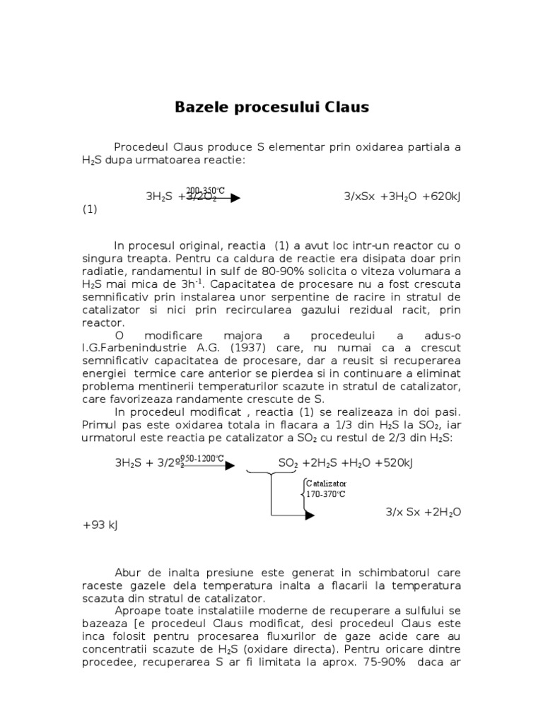 Procedeul Claus produce S elementar prin oxidarea partiala a H2S dupa urmatoarea reactie: 3H2S +3/2O2 (1) In procesul original, reactia (1) a avut loc intr-un reactor cu o singura treapta. Pentru ca caldura de reactie era disipata doar prin radiatie, randamentul in sulf de 80-90% solicita o viteza volumara a H2S mai mica de 3h-1. Capacitatea de procesare nu a fost crescuta semnificativ prin instalarea unor serpentine de racire in stratul de catalizator si nici prin recircularea gazului rezidual racit, prin reactor. O modificare majora a procedeului a adus-o [Link] A.G. (1937) care, nu numai ca a crescut semnificativ capacitatea de procesare, dar a reusit si recuperarea energiei termice care anterior se pierdea si in continuare a eliminat problema mentinerii temperaturilor scazute in stratul de catalizator, care favorizeaza randamente crescute de S. In procedeul modificat , reactia (1) se realizeaza in doi pasi. Primul pas este oxidarea totala in flacara a 1/3 din H2S la SO2, iar urmatorul este reactia pe catalizator a SO2 cu restul de 2/3 din H2S: