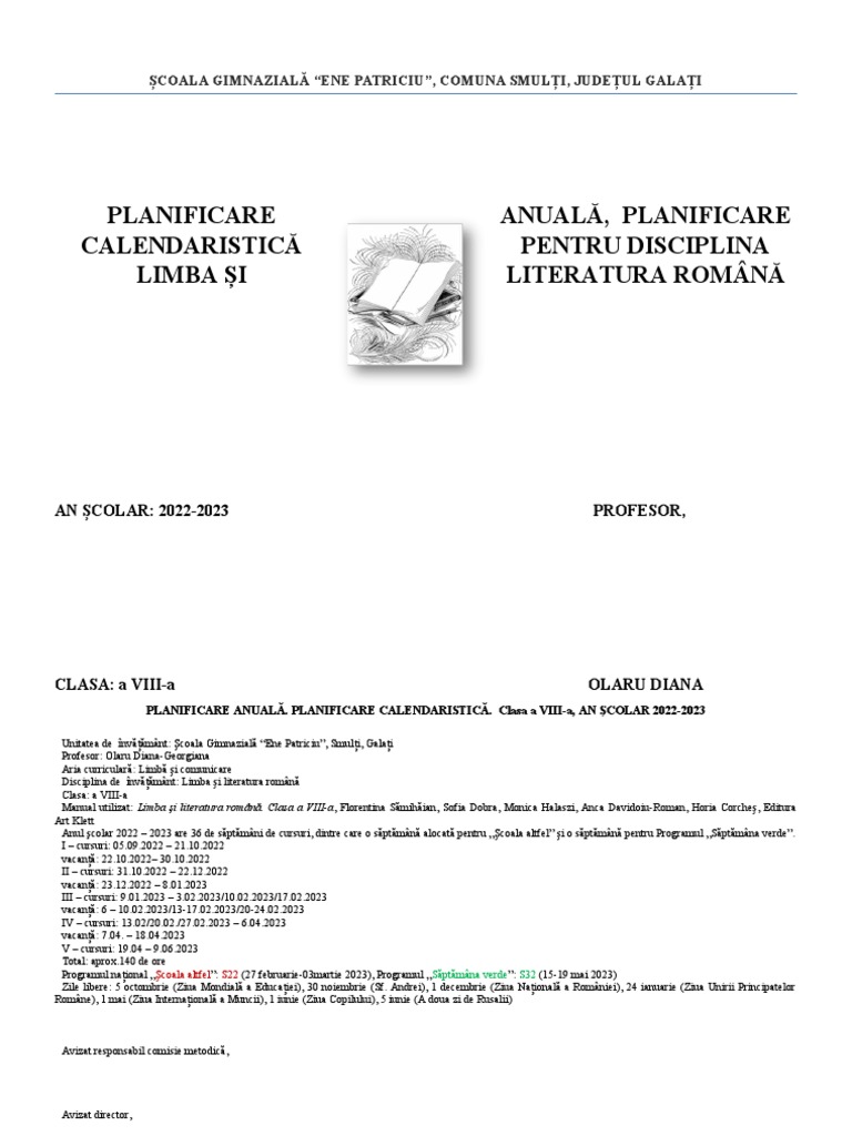 PLANIFICARE CALENDARISTICĂ- AN ȘCOLAR 2022-2023-