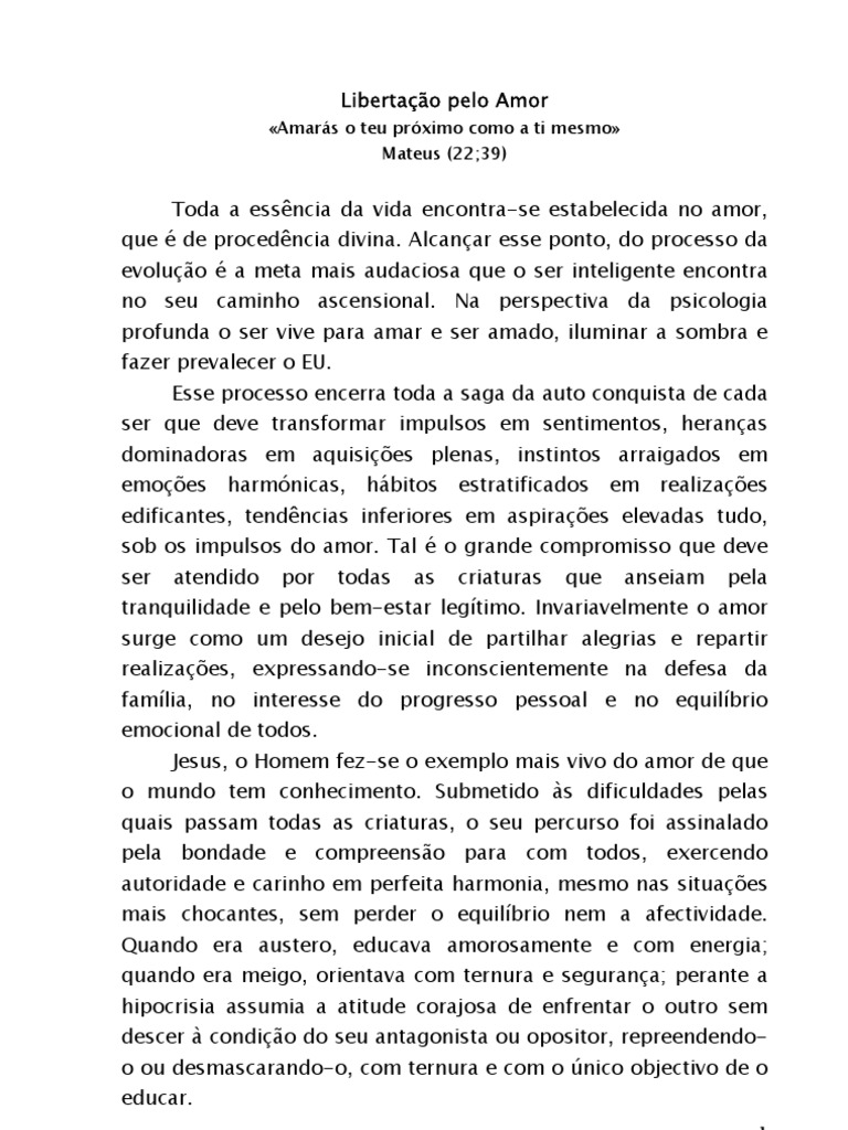 Toda a essência da vida encontra-se estabelecida no amor, que é de procedência divina. Alcançar esse ponto, do processo da evolução é a meta mais audaciosa que o ser inteligente encontra no seu caminho ascensional. Na perspectiva da psicologia profunda o ser vive para amar e ser amado, iluminar a sombra e fazer prevalecer o EU. Esse processo encerra toda a saga da auto conquista de cada ser que deve transformar impulsos em sentimentos, heranças dominadoras em aquisições plenas, instintos arraigados em emoções harmónicas, hábitos estratificados em realizações edificantes, tendências inferiores em aspirações elevadas tudo, sob os impulsos do amor. Tal é o grande compromisso que deve ser atendido por todas as criaturas que anseiam pela tranquilidade e pelo bem-estar legítimo. Invariavelmente o amor surge como um desejo inicial de partilhar alegrias e repartir realizações, expressando-se inconscientemente na defesa da família, no interesse do progresso pessoal e no equilíbrio emocional de todos. Jesus, o Homem fez-se o exemplo mais vivo do amor de que o mundo tem conhecimento. Submetido às dificuldades pelas quais passam todas as criaturas, o seu percurso foi assinalado pela bondade e compreensão para com todos, exercendo autoridade e carinho em perfeita harmonia, mesmo nas situações mais chocantes, sem perder o equilíbrio nem a afectividade. Quando era austero, educava amorosamente e com energia; quando era meigo, orientava com ternura e segurança; perante a hipocrisia assumia a atitude corajosa de enfrentar o outro sem descer à condição do seu antagonista ou opositor, repreendendo- o ou desmascarando-o, com ternura e com o único objectivo de o educar.
