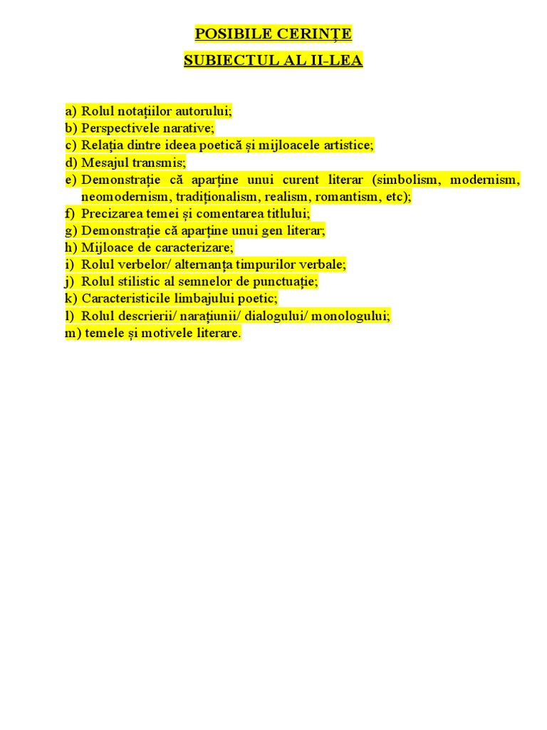 k) Caracteristicile limbajului poetic;