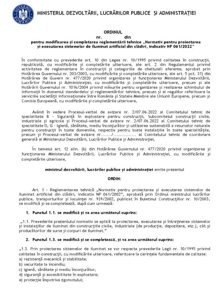 și executarea sistemelor de iluminat artificial din clădiri, indicativ NP 061/2022”