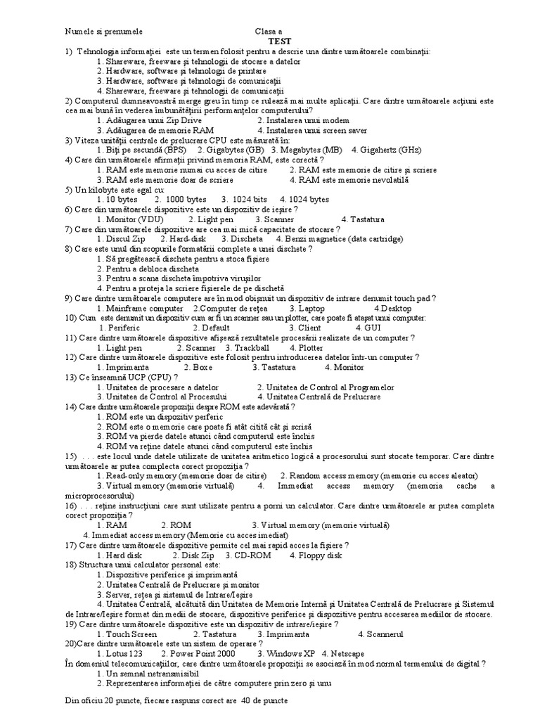 Din oficiu 20 puncte, fiecare raspuns corect are 40 de puncte
