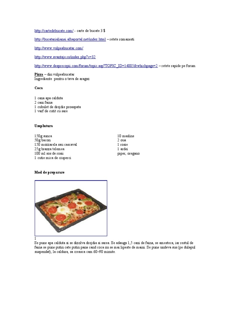 Aluat de pizza Ingrediente 225 gr. faina, sare, 1 pachetel de drojdie, 2 linguri de ulei, sos