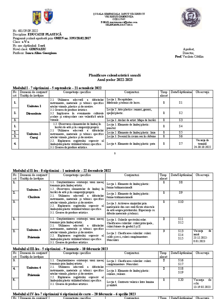 Unitatea 1 artelor vizuale, plastice și decorative.