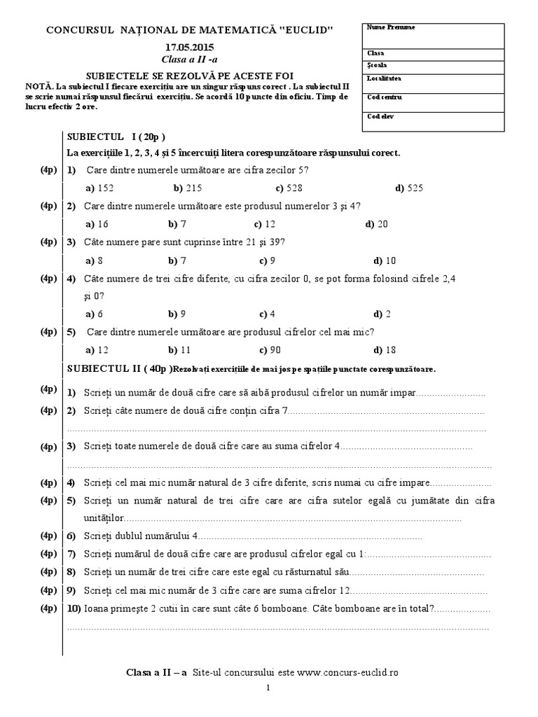se scrie numai răspunsul fiecărui exerciţiu. Se acordă 10 puncte din oficiu. Timp de Cod centru