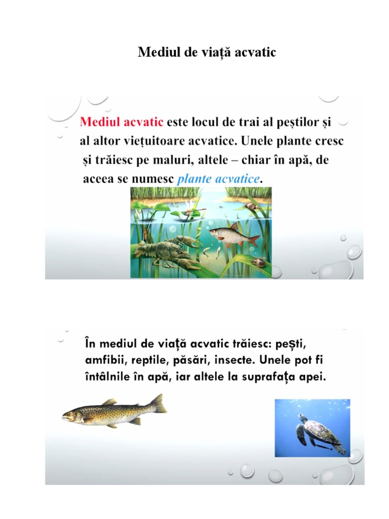 Documentul se referă la mediul de viață acvatic, care include apa dulce și sărată precum râuri, lacuri, oceane și mări unde trăiesc organisme acvatice.