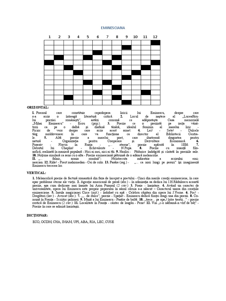 eminesciene. 5. Insula magicianei Circe (mit.) - îmbibat cu apă - Celebru căpitan din opera lui [Link]. 6. Foc! -