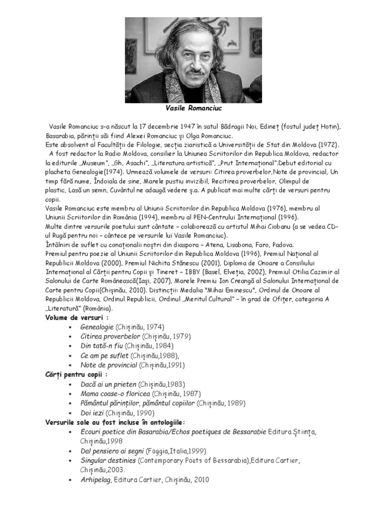 Carte pentru Copii(Chișinău, 2010). Distincții: Medalia "Mihai Eminescu", Ordinul de Onoare al