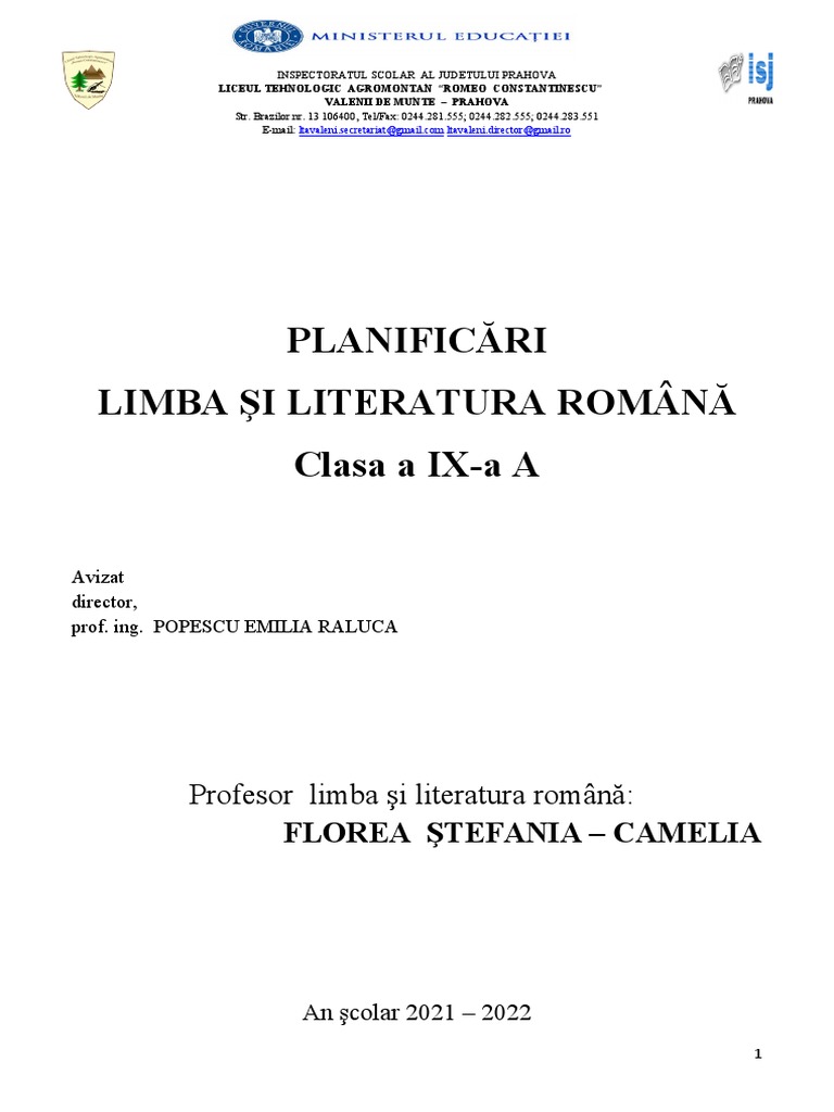Disciplina:LIMBA ŞI LITERATURA ROMÂNĂ; clasa a IX-a