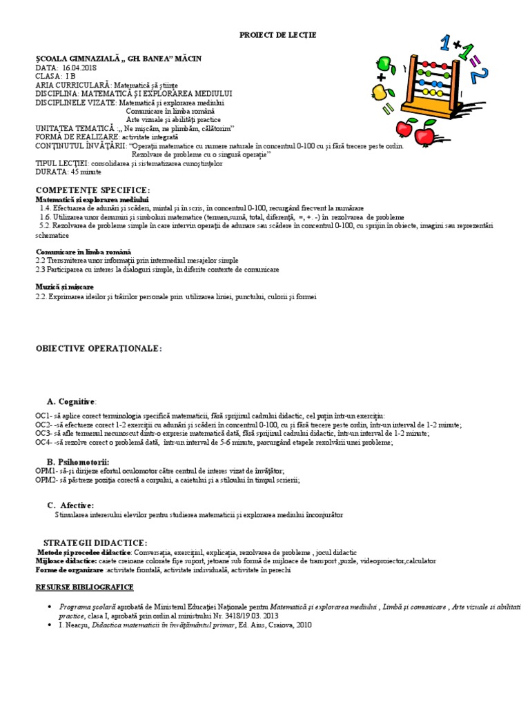 CONŢINUTUL ÎNVĂŢĂRII: “Operaţii matematice cu numere naturale în concentrul 0-100 cu și fără trecere peste ordin.