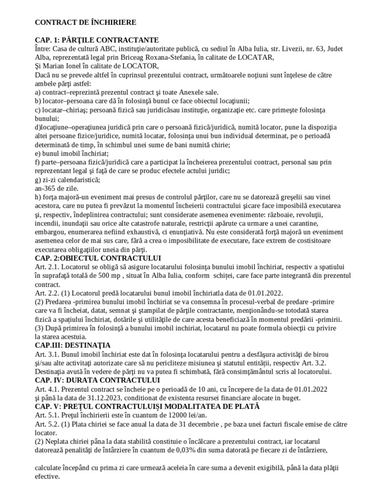 Art. 2.2. (1) Locatorul predă locatarului bunul imobil închiriatla data de 01.01.2022.
