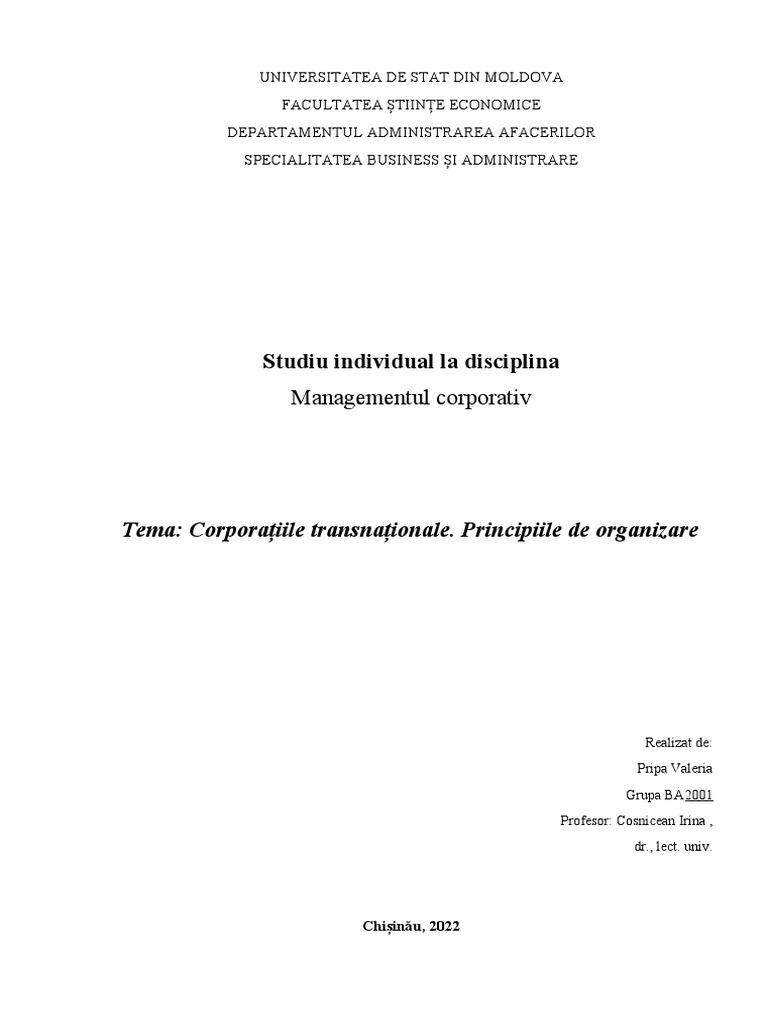 Tema: Corporațiile transnaționale. Principiile de organizare