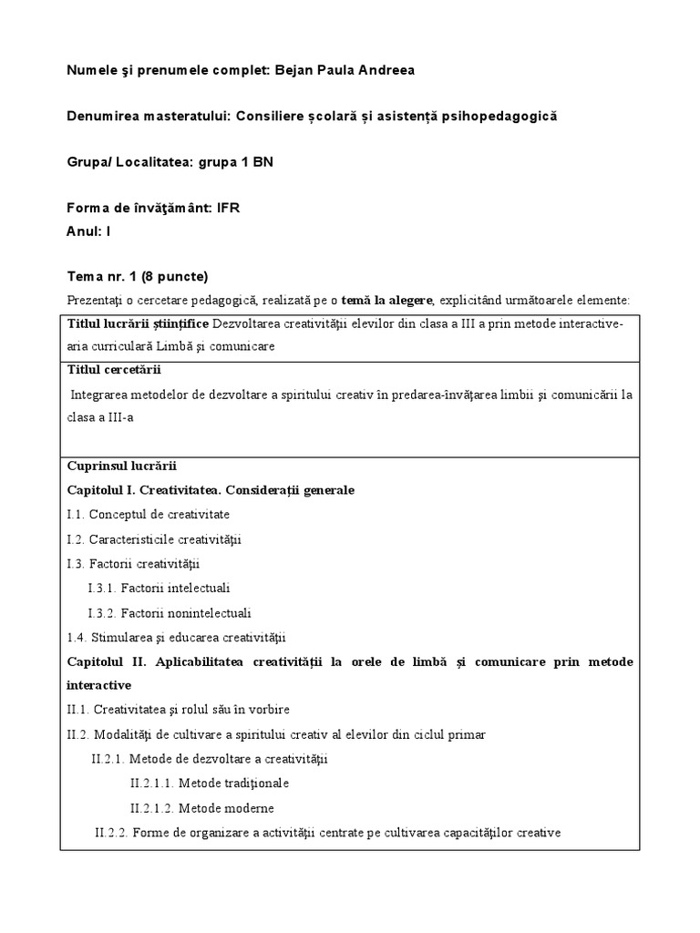 Titlul lucrării ştiinţifice Dezvoltarea creativităţii elevilor din clasa a III a prin metode interactive-
