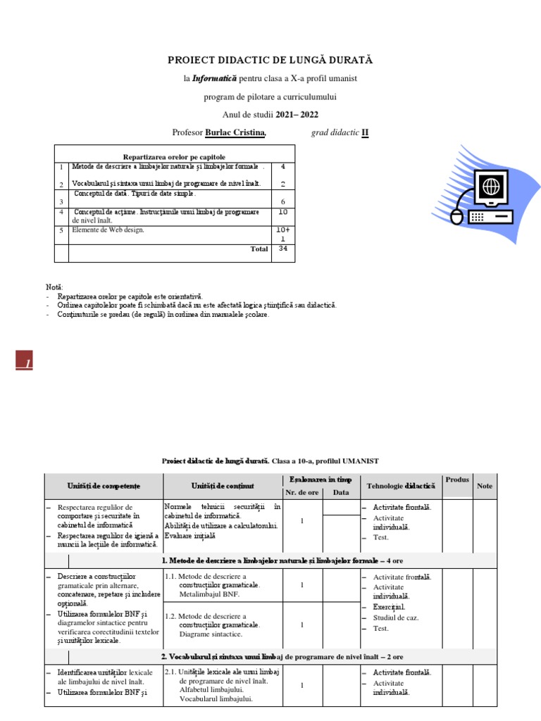 Proiect didactic de lungă durată. Clasa a 10-a, profilul UMANIST
