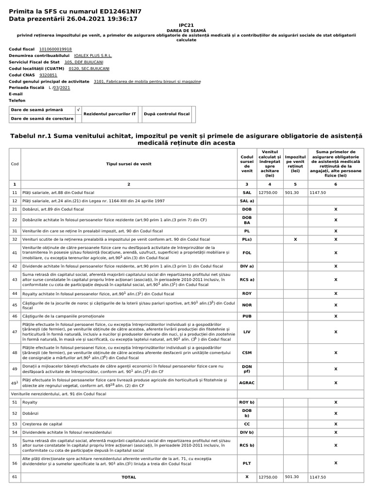 Notă: coloana 3 este echivalentă cu suma reflectată la codurile sursei de venit SAL și SAL a) reflectate în col.5 din tabelul nr.1
