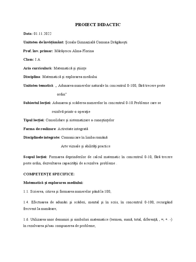 ,, Adunarea și scăderea numerelor în concentrul 0-10.