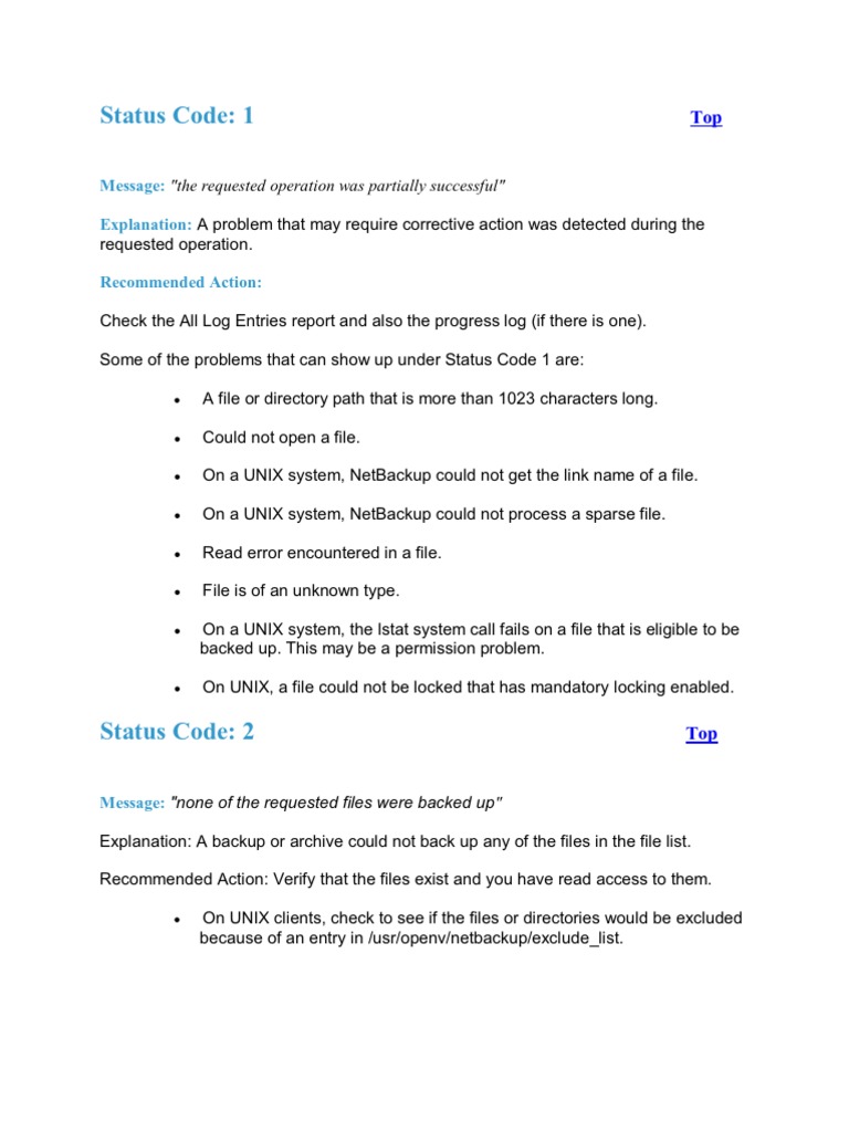 A file or directory path that is more than 1023 characters long. Could not open a file. On a UNIX system, NetBackup could not get the link name of a file. On a UNIX system, NetBackup could not process a sparse file. Read error encountered in a file. File is of an unknown type. On a UNIX system, the lstat system call fails on a file that is eligible to be backed up. This may be a permission problem. On UNIX, a file could not be locked that has mandatory locking enabled.