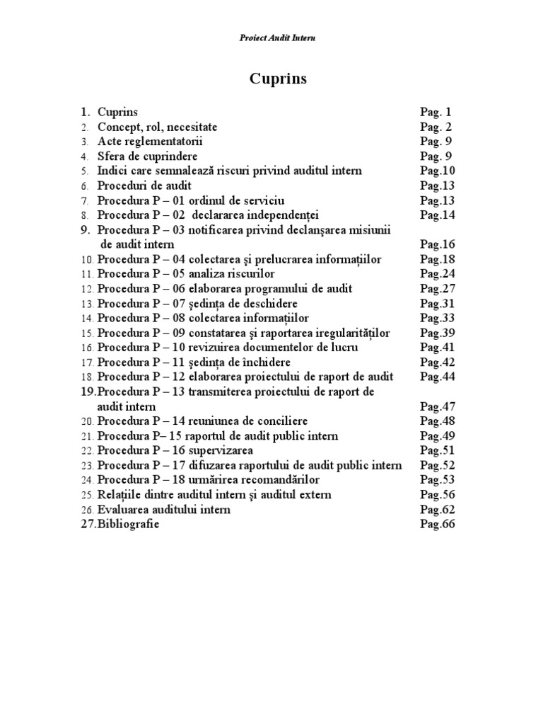 1. Cuprins 2. Concept, rol, necesitate 3. Acte reglementatorii 4. Sfera de cuprindere 5. Indici care semnaleaz riscuri privind auditul intern 6. Proceduri de audit 7. Procedura P 01 ordinul de serviciu 8. Procedura P 02 declararea independenei 9. Procedura P 03 notificarea privind declanarea misiunii de audit intern 10. Procedura P 04 colectarea i prelucrarea informaiilor 11. Procedura P 05 analiza riscurilor 12. Procedura P 06 elaborarea programului de audit 13. Procedura P 07 edina de deschidere 14. Procedura P 08 colectarea informaiilor 15. Procedura P 09 constatarea i raportarea iregularitilor 16. Procedura P 10 revizuirea documentelor de lucru 17. Procedura P 11 edina de nchidere 18. Procedura P 12 elaborarea proiectului de raport de audit [Link] P 13 transmiterea proiectului de raport de audit intern 20. Procedura P 14 reuniunea de conciliere 21. Procedura P 15 raportul de audit public intern 22. Procedura P 16 supervizarea 23. Procedura P 17 difuzarea raportului de audit public intern 24. Procedura P 18 urmrirea recomandrilor 25. Relaiile dintre auditul intern i auditul extern 26. Evaluarea auditului intern [Link] Pag. 1 Pag. 2 Pag. 9 Pag. 9 Pag.10 Pag.13 Pag.13 Pag.14 Pag.16 Pag.18 Pag.24 Pag.27 Pag.31 Pag.33 Pag.39 Pag.41 Pag.42 Pag.44 Pag.47 Pag.48 Pag.49 Pag.51 Pag.52 Pag.53 Pag.56 Pag.62 Pag.66