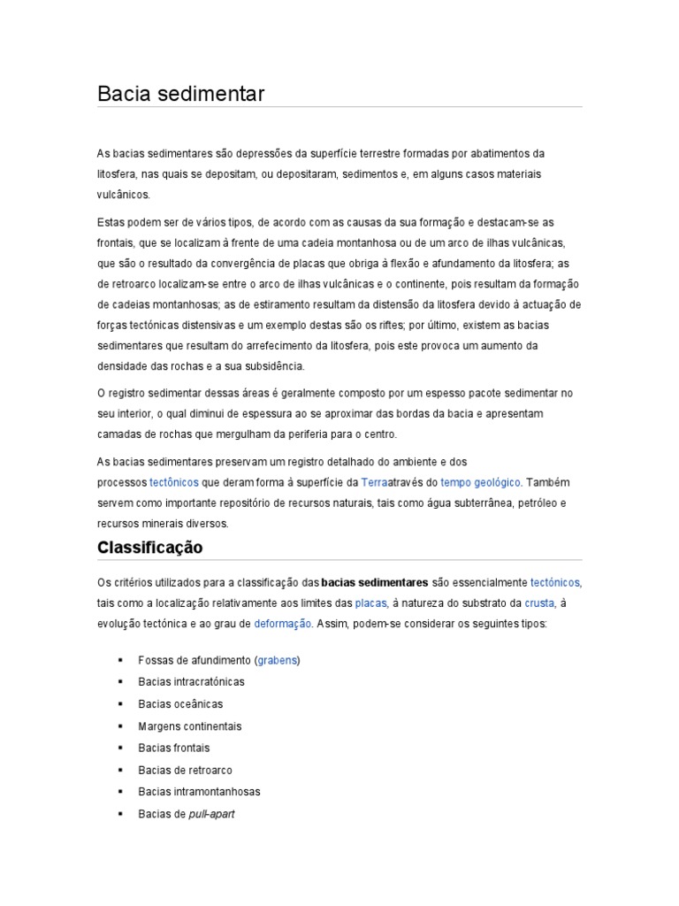 Os critrios utilizados para a classificao das bacias sedimentares so essencialmente tectnicos, tais como a localizao relativamente aos limites das placas, natureza do substrato da crusta, evoluo tectnica e ao grau de deformao. Assim, podem-se considerar os seguintes tipos:
