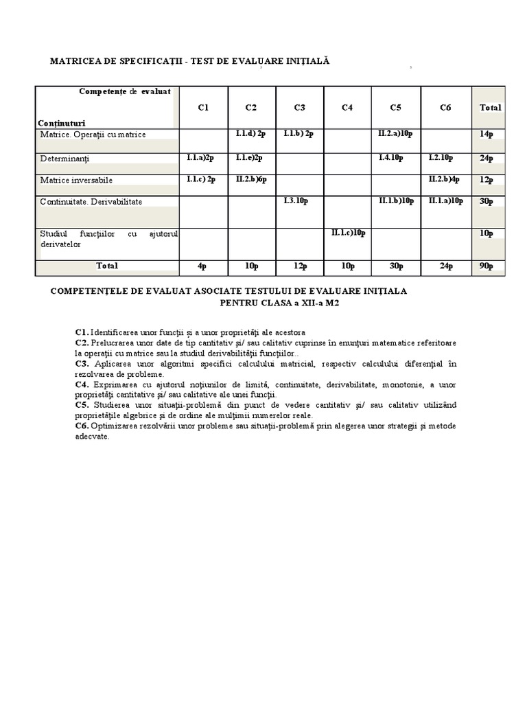 MATRICEA DE SPECIFICAŢII - TEST DE EVALUARE INIŢIALĂ