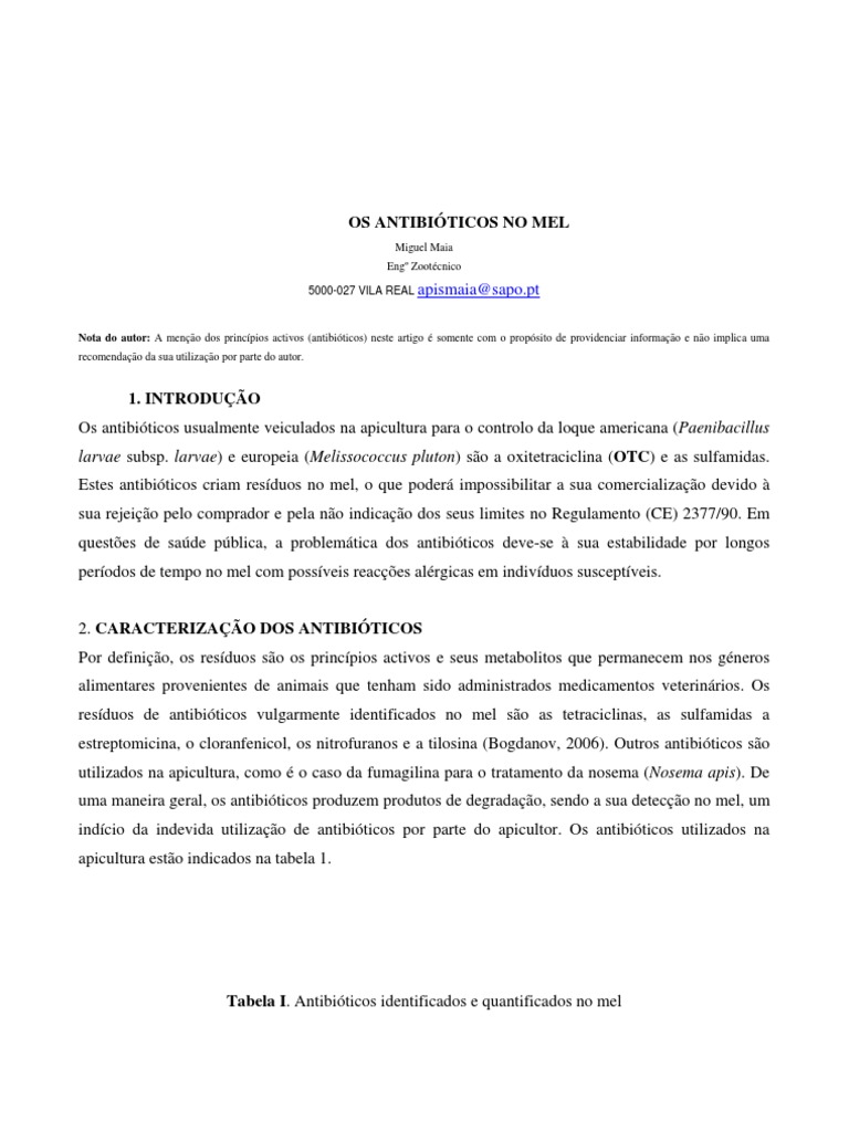 2. CARACTERIZAO DOS ANTIBITICOS Por definio, os resduos so os princpios activos e seus metabolitos que permanecem nos gneros alimentares provenientes de animais que tenham sido administrados medicamentos veterinrios. Os resduos de antibiticos vulgarmente identificados no mel so as tetraciclinas, as sulfamidas a estreptomicina, o cloranfenicol, os nitrofuranos e a tilosina (Bogdanov, 2006). Outros antibiticos so utilizados na apicultura, como o caso da fumagilina para o tratamento da nosema (Nosema apis). De uma maneira geral, os antibiticos produzem produtos de degradao, sendo a sua deteco no mel, um indcio da indevida utilizao de antibiticos por parte do apicultor. Os antibiticos utilizados na apicultura esto indicados na tabela 1.