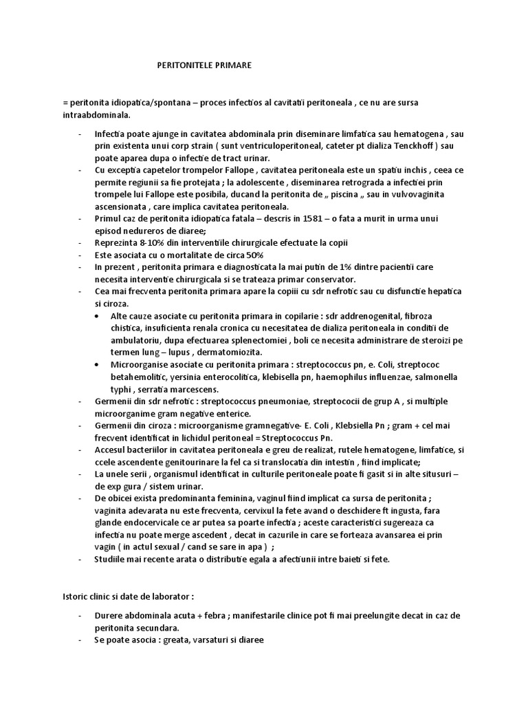 Microorganise asociate cu peritonita primara : streptococcus pn, e. Coli, streptococ