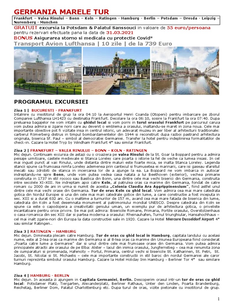 Frankfurt – Valea Rinului – Bonn – Koln – Ratingen - Hamburg - Berlin – Potsdam – Dresda - Leipzig –