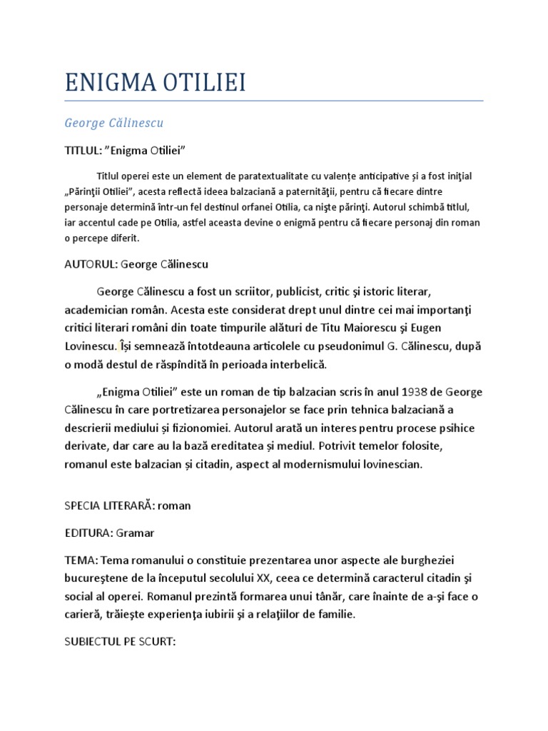 TITLUL: ”Enigma Otiliei”