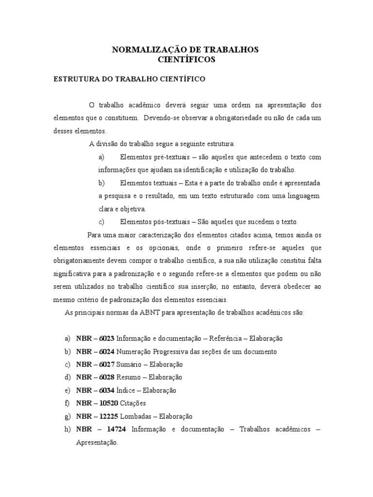 ESTRUTURA DO TRABALHO CIENTFICO O trabalho acadmico dever seguir uma ordem na apresentao dos elementos que o constituem. Devendo-se observar a obrigatoriedade ou no de cada um desses elementos. A diviso do trabalho segue a seguinte estrutura: a) b) Elementos pr-textuais so aqueles que antecedem o texto com Elementos textuais Esta a parte do trabalho onde apresentada informaes que ajudam na identificao e utilizao do trabalho. a pesquisa e o resultado, em um texto estruturado com uma linguagem clara e objetiva. c) Elementos ps-textuais So aqueles que sucedem o texto. Para uma maior caracterizao dos elementos citados acima, temos ainda os elementos essenciais e os opcionais, onde o primeiro refere-se aqueles que obrigatoriamente devem compor o trabalho cientfico, a sua no utilizao constitui falta significativa para a padronizao e o segundo refere-se a elementos que podem ou no serem utilizados no trabalho cientfico sua insero, no entanto, dever obedecer ao mesmo critrio de padronizao dos elementos essenciais. As principais normas da ABNT para apresentao de trabalhos acadmicos so: a) NBR 6023 Informao e documentao Referncia Elaborao b) NBR 6024 Numerao Progressiva das sees de um documento c) NBR 6027 Sumrio Elaborao d) NBR 6028 Resumo Elaborao e) NBR 6034 ndice Elaborao f) NBR 10520 Citaes g) NBR 12225 Lombadas Elaborao h) NBR 14724 Informao e documentao Trabalhos acadmicos Apresentao.