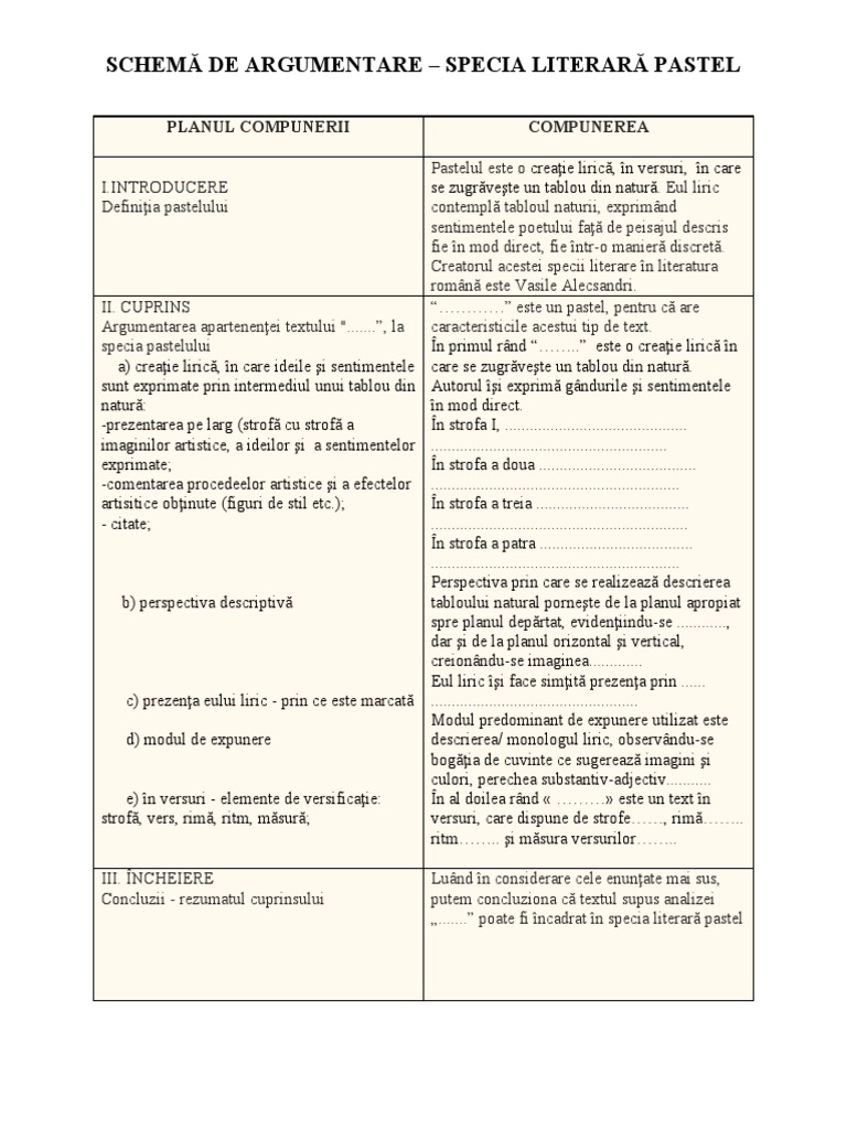 SCHEMĂ DE ARGUMENTARE – SPECIA LITERARĂ PASTEL