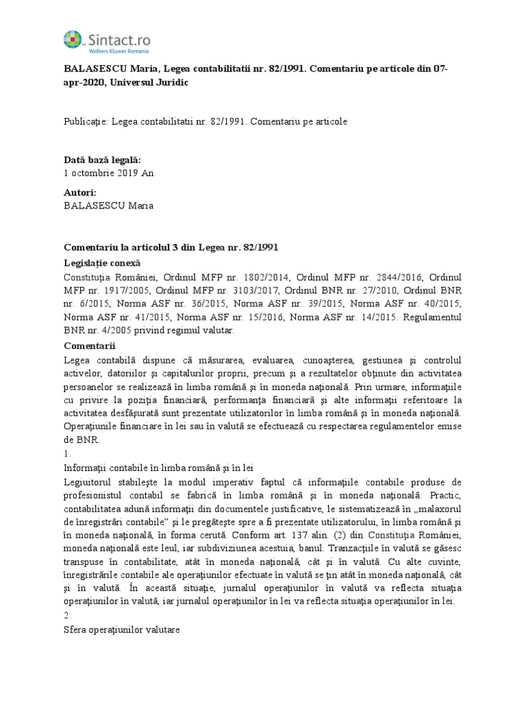 BALASESCU Maria, Legea contabilitatii nr. 82/1991.