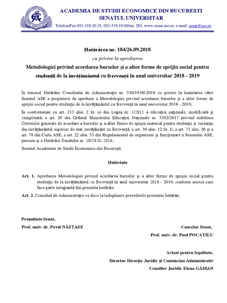 Prezenta Metodologie a fost aprobată în Ședința Senatului Academiei de Studii Economice din