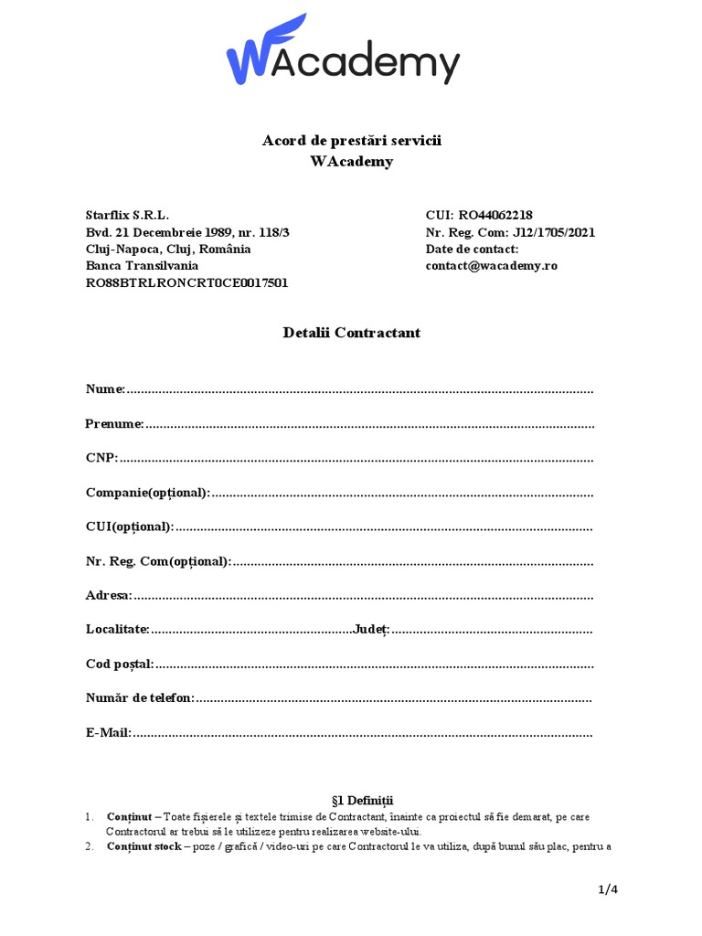 Acest formular va fi trimis prin e-mail după ce Contractantul pune la dispoziție găzduirea web