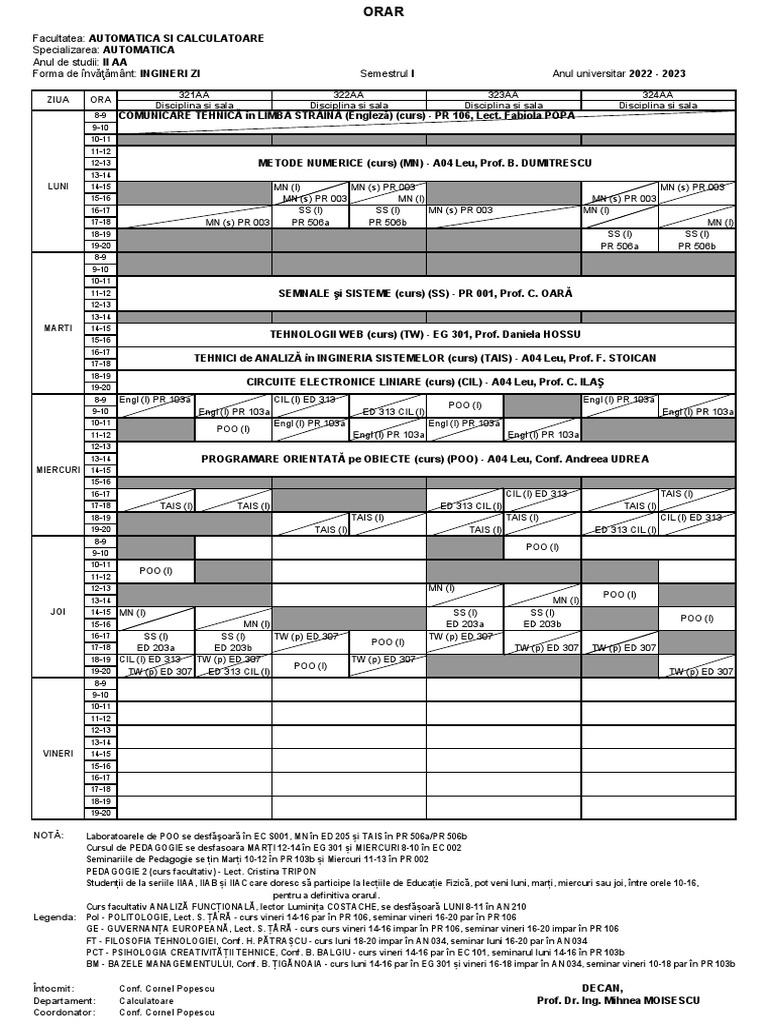 NOTĂ: Laboratoarele de POO se desfăşoară în EC S001, MN în ED 205 și TAIS în PR 506a/PR 506b